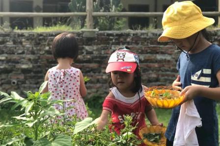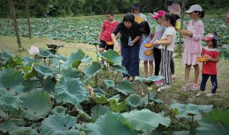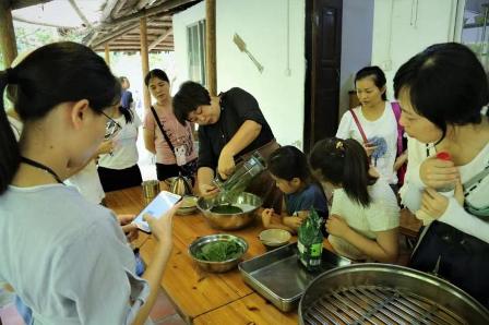 耕讀心園,位于五桂山腳下,坐擁30畝土地,種植了大量的蔬菜和瓜果,還有一片荷塘。活動期間,心園的老師帶著孩子們參觀農場,帶孩子們認識每一種植物,并耐心的為他們講解辨別和食用的方法。還采摘了艾葉一起做了艾餅。蒸熟后,孩子們一起分享自己做的小點心,格外有趣。大人們也重返童年,到荷塘采摘蓮蓬,品嘗新鮮的蓮子,清甜爽口。