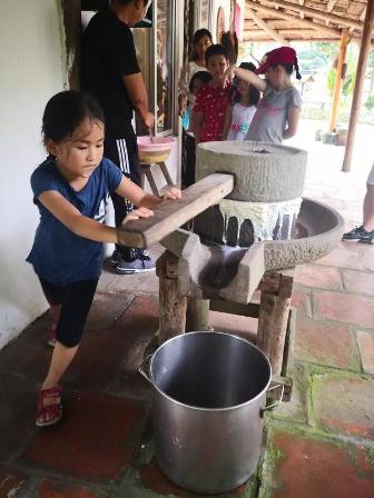 在農場的一側,有一口老式的磨坊,老師帶著孩子們從浸泡豆子到推動石磨、再到煮豆漿,孩子們參與感非常強。你看他們推動石磨的小身影,哪像平時在家里嬌滴滴的樣子。